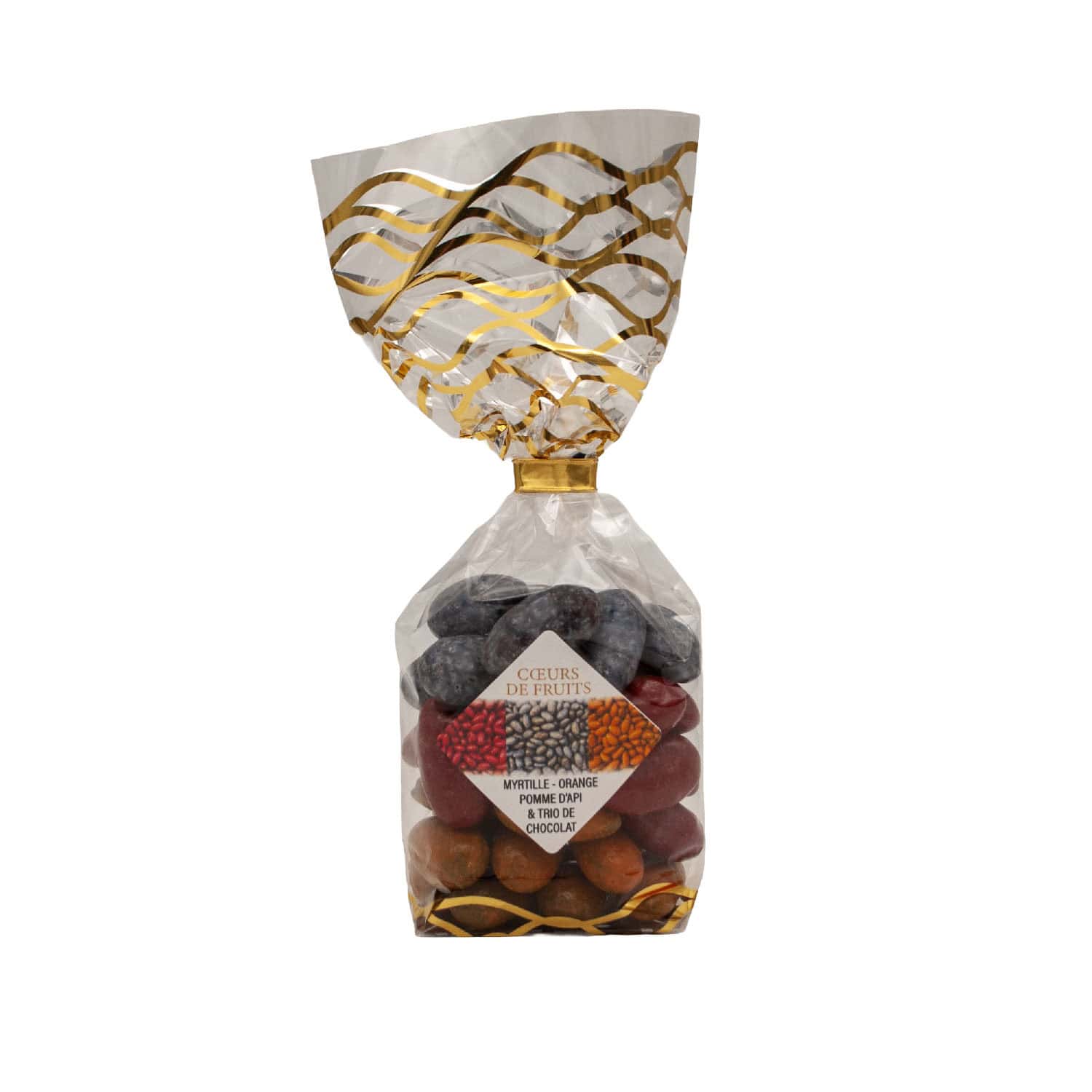 Ingrédients : chocolat noir (pâte de cacao, sucre, beurre de cacao, émulsifiant : lécithine de SOJA), chocolat au lait (sucre, beurre de cacao, poudre de LAIT entier, pâte de cacao, LACTOSERUM en poudre, émulsifiant : lécithine de SOJA, arôme naturel de vanille), sucre, purée d’orange, purée de pomme, pulpe de myrtille, caramel, sirop de glucose, BEURRE, beurre de cacao, poudre de LAIT entier, émulsifiant : lécithine de SOJA, antioxydant : vitamine C, arôme naturel de myrtille avec d’autres arômes naturels, gélifiant : pectine, acidifiant : acide tartrique, huile essentiel d’orange, colorants : extrait de paprika, curcumine, carmin, indigotine, agents d’enrobage : gomme arabique, gomme laque. Traces possibles d’AMANDES et de NOISETTES.