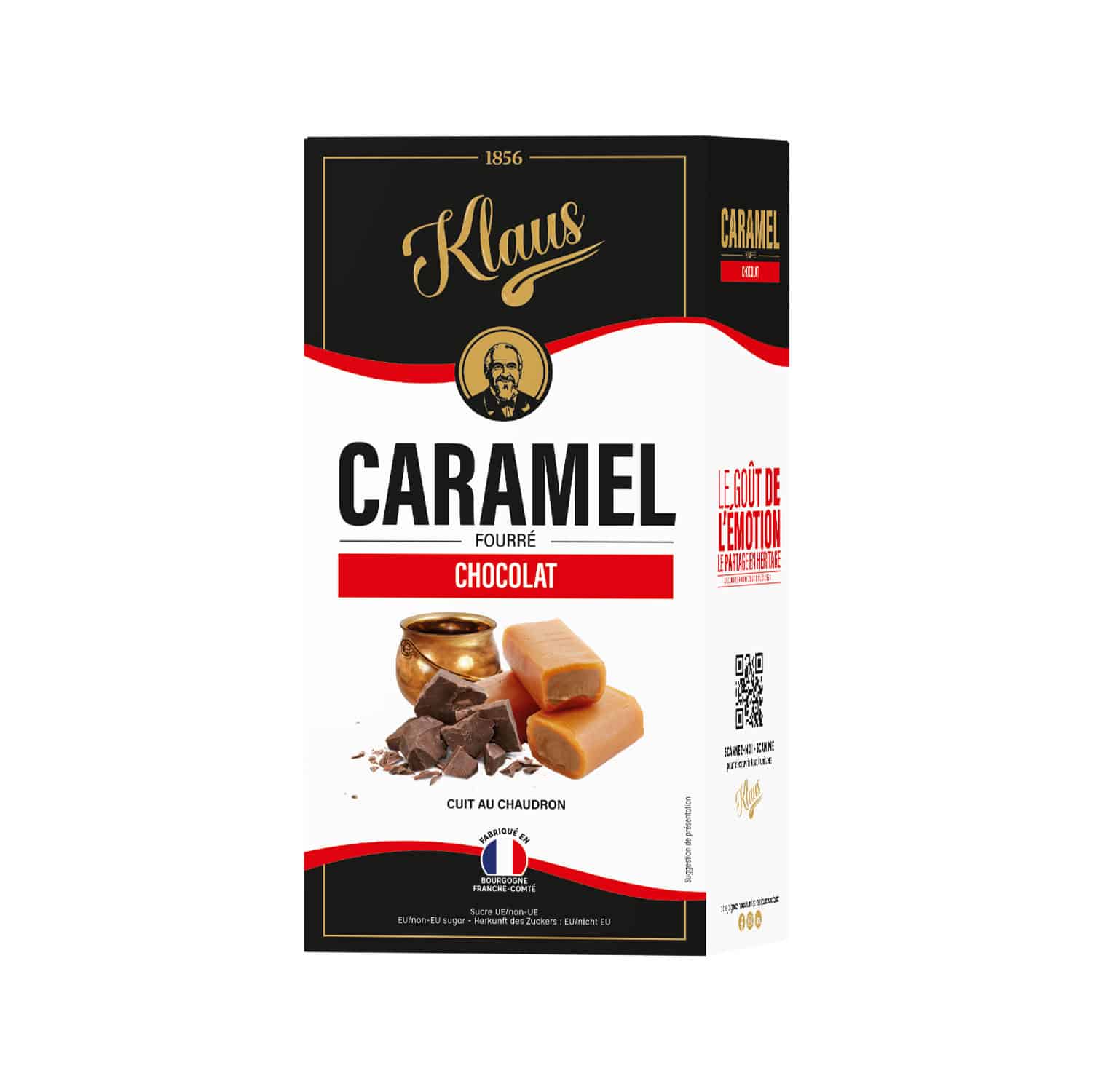 INGREDIENTS : sirop de glucose, sucre, LAIT frais écrémé 7%, LAIT entier en poudre, chocolat noir 4% (sucre, pâte de cacao, beurre de cacao, matière grasse LAITIERE en poudre, émulsifiant : lecithine de SOJA), BEURRE, sirop de sucre inverti, huile végétale (palme*), sel, épaississant : maltodextrine. *Certifiée RSPO (Roundtable on Sustainable Palm Oil)