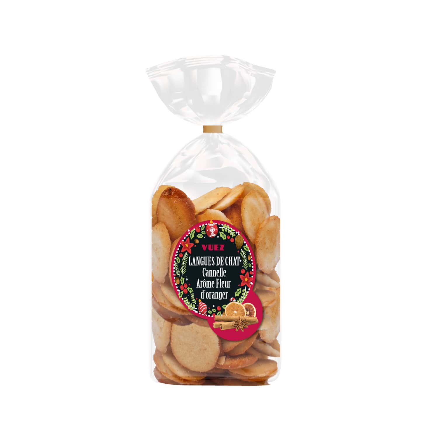 Ingrédients : sucre, farine de BLE, blancs d’OEUF, BEURRE, arome vanille, eau de fleur d’oranger, épaississant : gomme arabique, gomme adragante, gomme xanthane, cannelle.