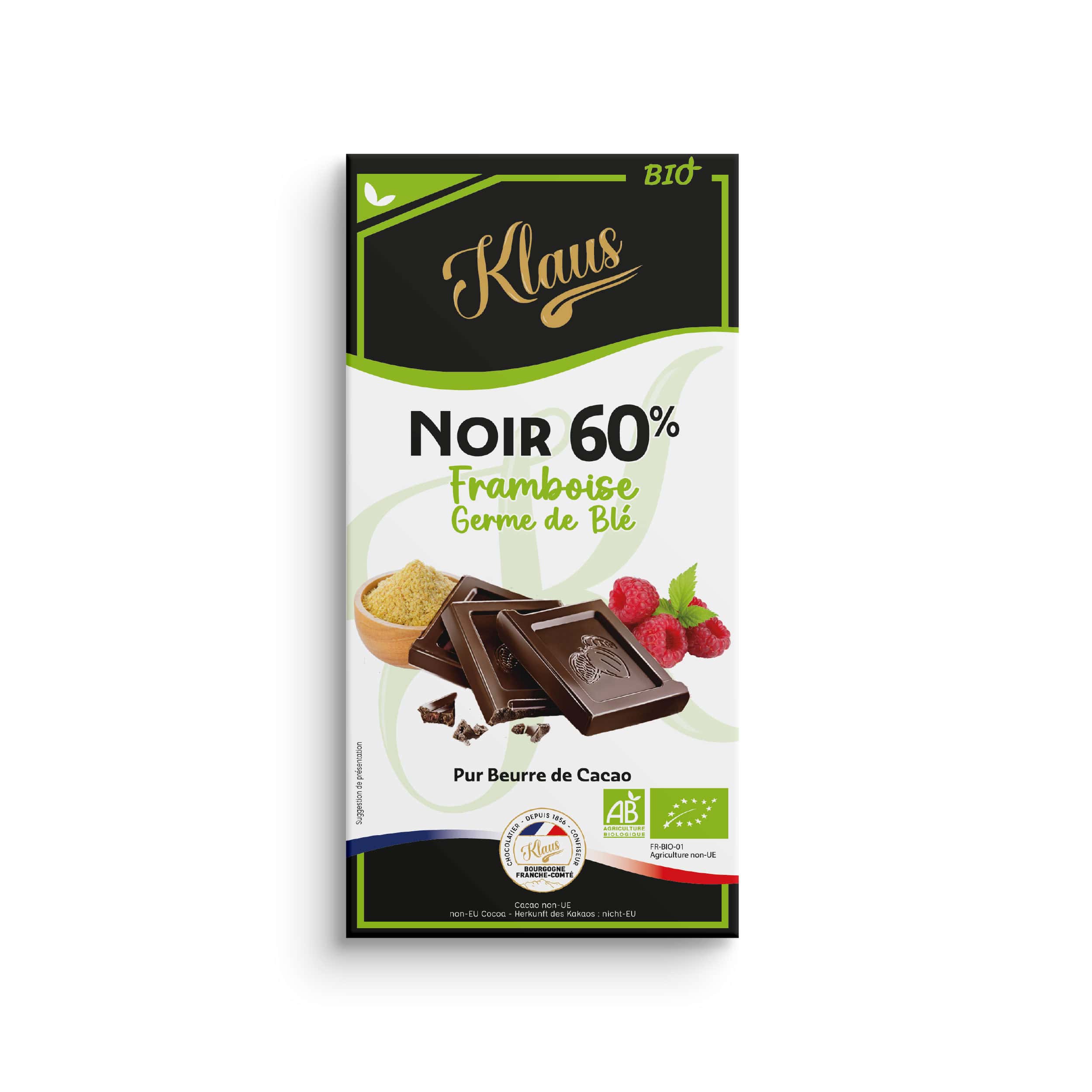 INGREDIENTS : pâte de cacao*, sucre de canne*, beurre de cacao*, germe de BLE* 7%, poudre de framboise* 3.5%. *ingrédients issus de l’Agriculture Biologique