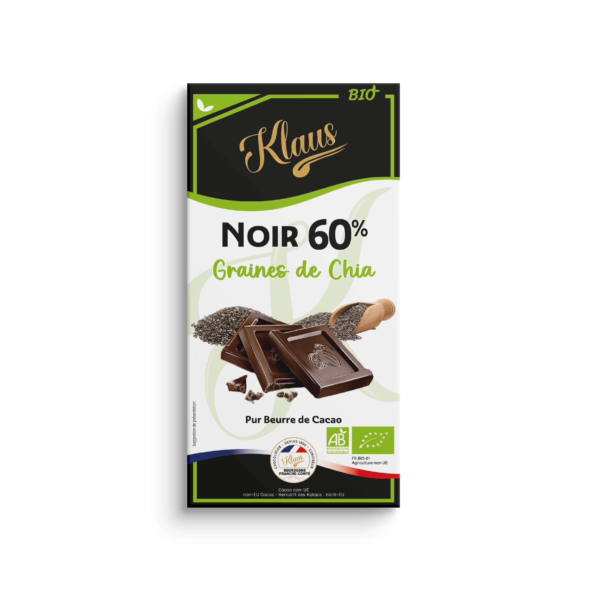INGREDIENTS : pâte de cacao*, sucre de canne*, graines de chia* 13%, beurre de cacao*. *ingrédients issus de l’Agriculture Biologique