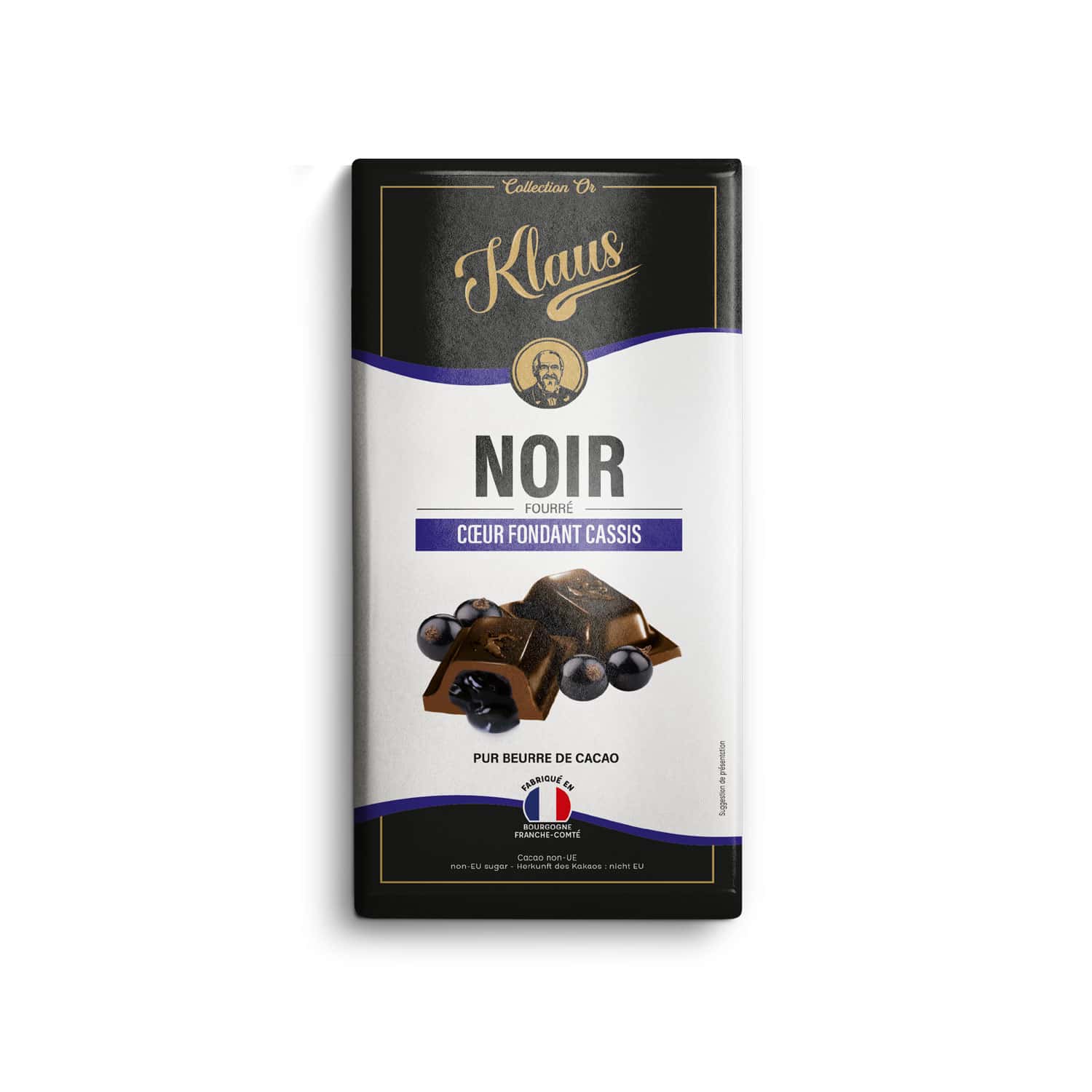 INGREDIENTS : pâte de cacao, sucre, purée de cassis 14%, sirop de glucose, beurre de cacao, matière grasse LAITIERE en poudre, jus de citron, émulsifiant : lécithine de SOJA, pectine.