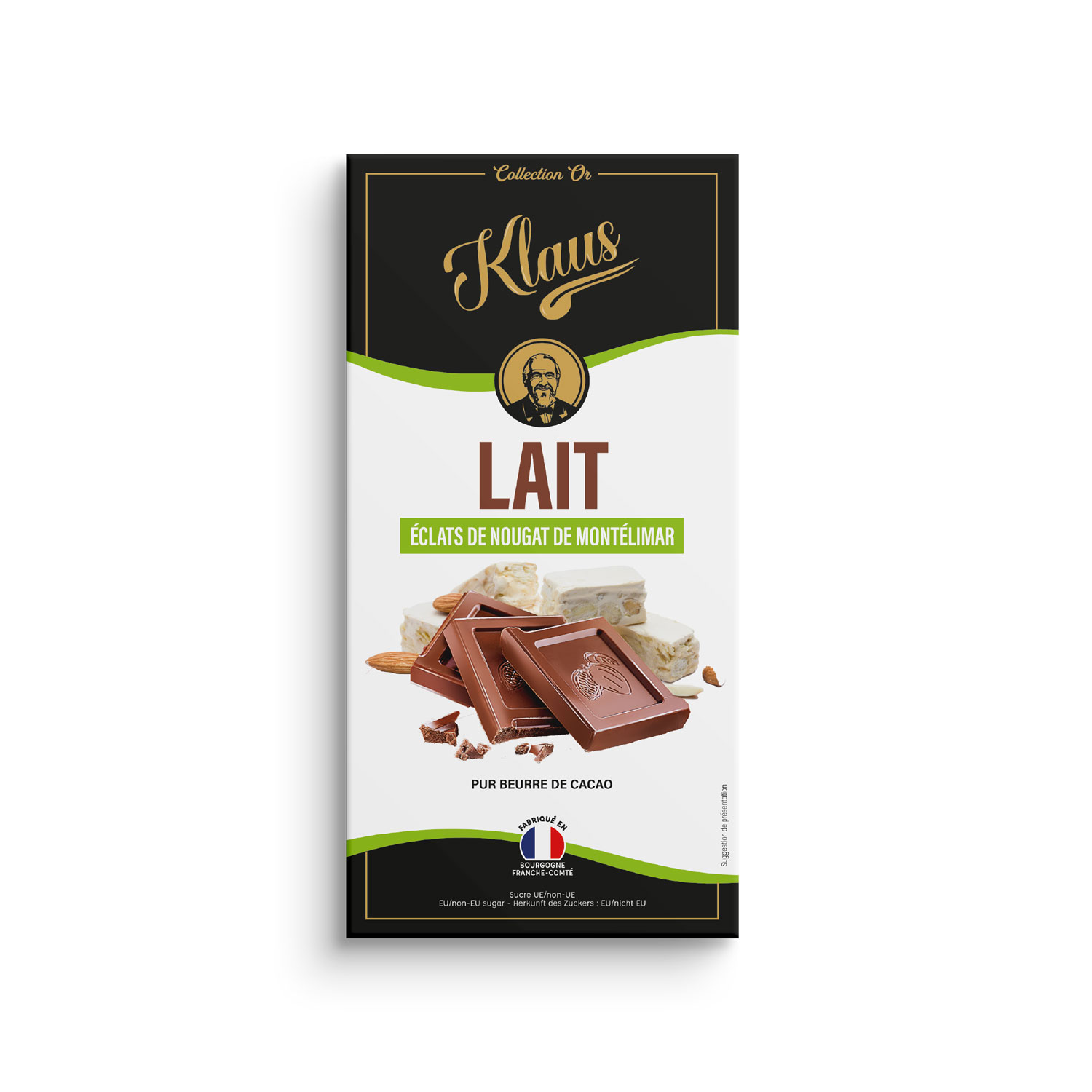 NGREDIENTS : chocolat au lait (sucre, beurre de cacao, LAIT entier en poudre, pâte de cacao, LACTOSERUM en poudre, émulsifiant : lécithine de SOJA, arôme naturel de vanille), brisures de nougat 5% (AMANDES émondées grillées, sucre, sirop de glucose, miel, beurre de cacao, blanc d’OEUF, pain azyme (fécule de pomme de terre, eau, huile d’olive), arôme naturel de vanille)